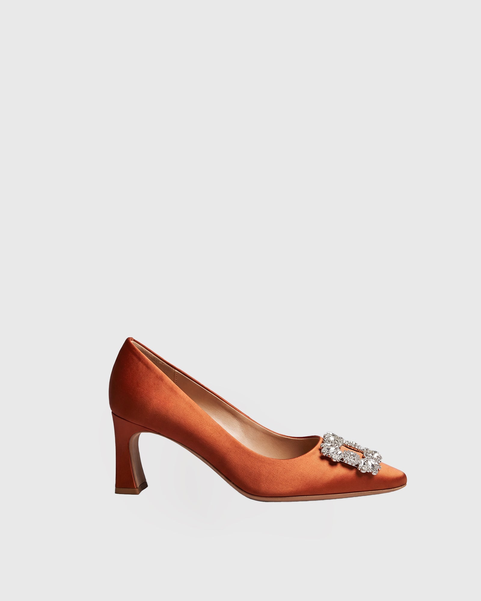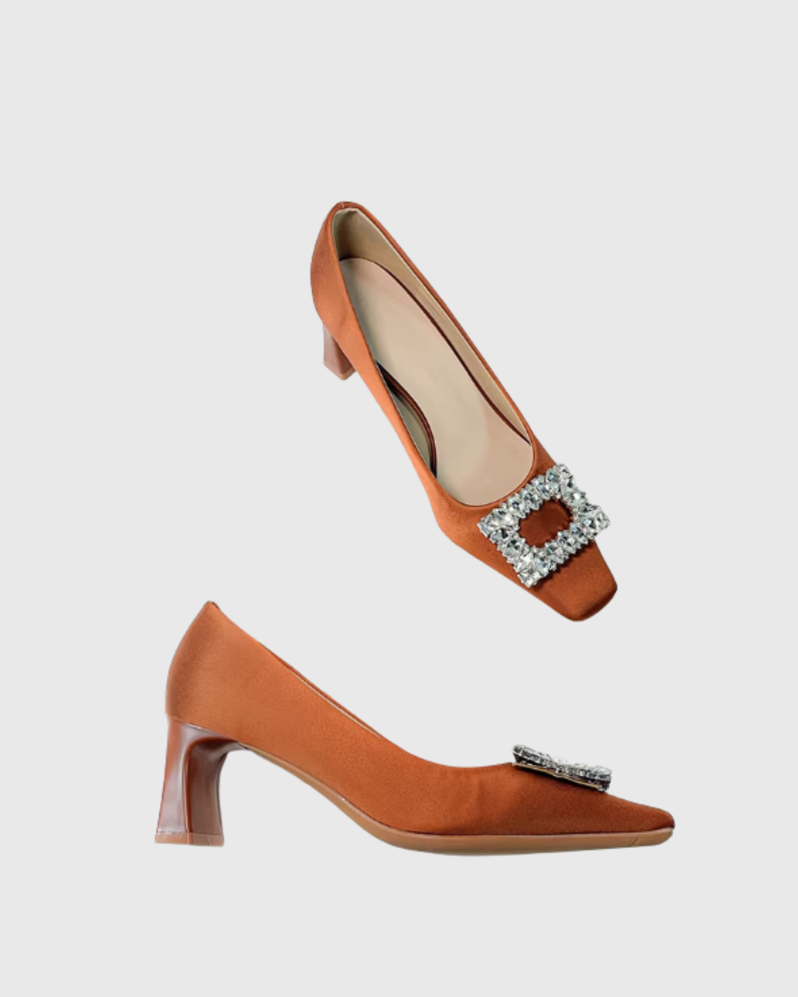 Elevate your step with the Sadah Chunky Heel Pumps in Orange. Crafted from luxurious satin, these statement pumps feature a comfortable 6.5 cm chunky heel that balances style with wearability. The eye-catching rhinestone buckle adds a touch of glamour to any outfit, while the easy pull-on design makes them effortless to slip on. Perfect for special occasions or when you want to make an impression. For the best fit, consider sizing up if you're between sizes.