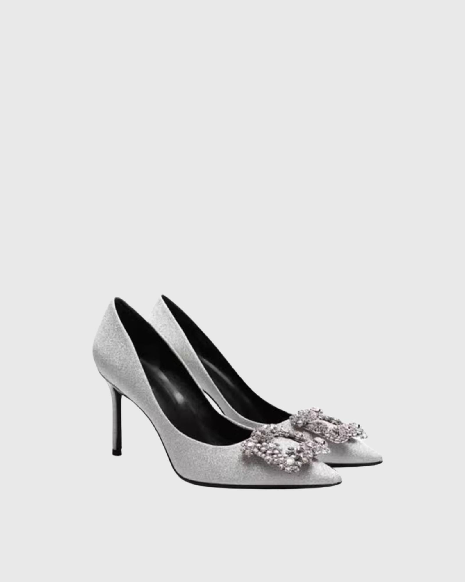 Elevate your evening look with the Sadah Rhinestone Buckle Pumps in Glitter Silver. Crafted from luxurious satin, these stunning pumps feature a dazzling rhinestone buckle detail that catches the light beautifully. The comfortable 6.5 cm heel provides the perfect balance of style and wearability, while the easy pull-on design makes them effortless to slip on. Perfect for special occasions, parties, or whenever you want to add a touch of glamour to your outfit. Note: If you're between sizes, we recommend sizing up for the best fit.