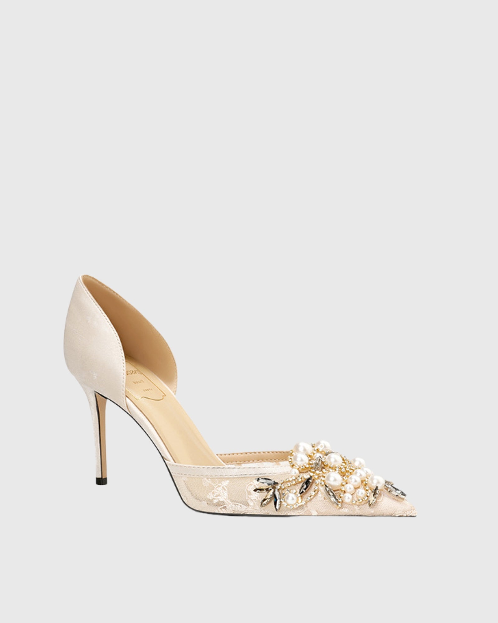 Elevate your evening look with the Sadb Pearl Embroidery Pumps in Ivory. Crafted from luxurious satin and leather, these open-toe pumps feature delicate pearl embroidery detailing and a charming bow accent. The 8cm heel provides a flattering lift, while the thin adjustable ankle strap ensures a secure, customized fit. Leather lining and sole offer comfort and durability for all-day wear.