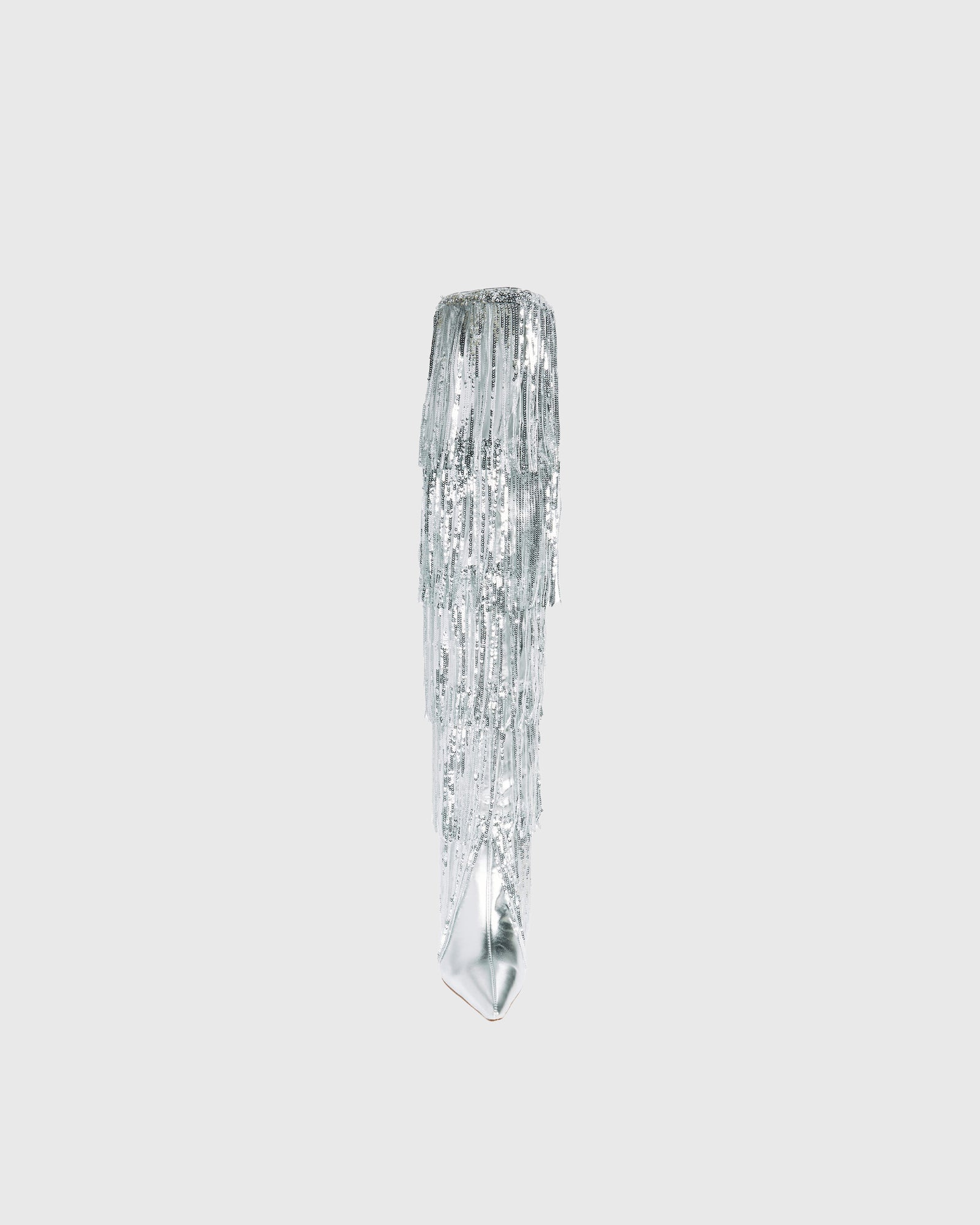 Introducing the stunning Debora Sequin Fringe Knee High Boots! These boots will elevate any outfit with their dazzling sequin details and trendy fringe design. Step out in style and make a statement with these must-have boots. Perfect for any fashion-forward individual looking to add a touch of glamour to their wardrobe.