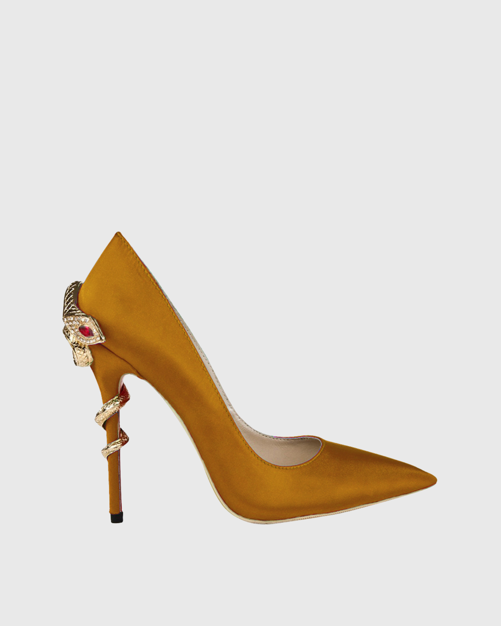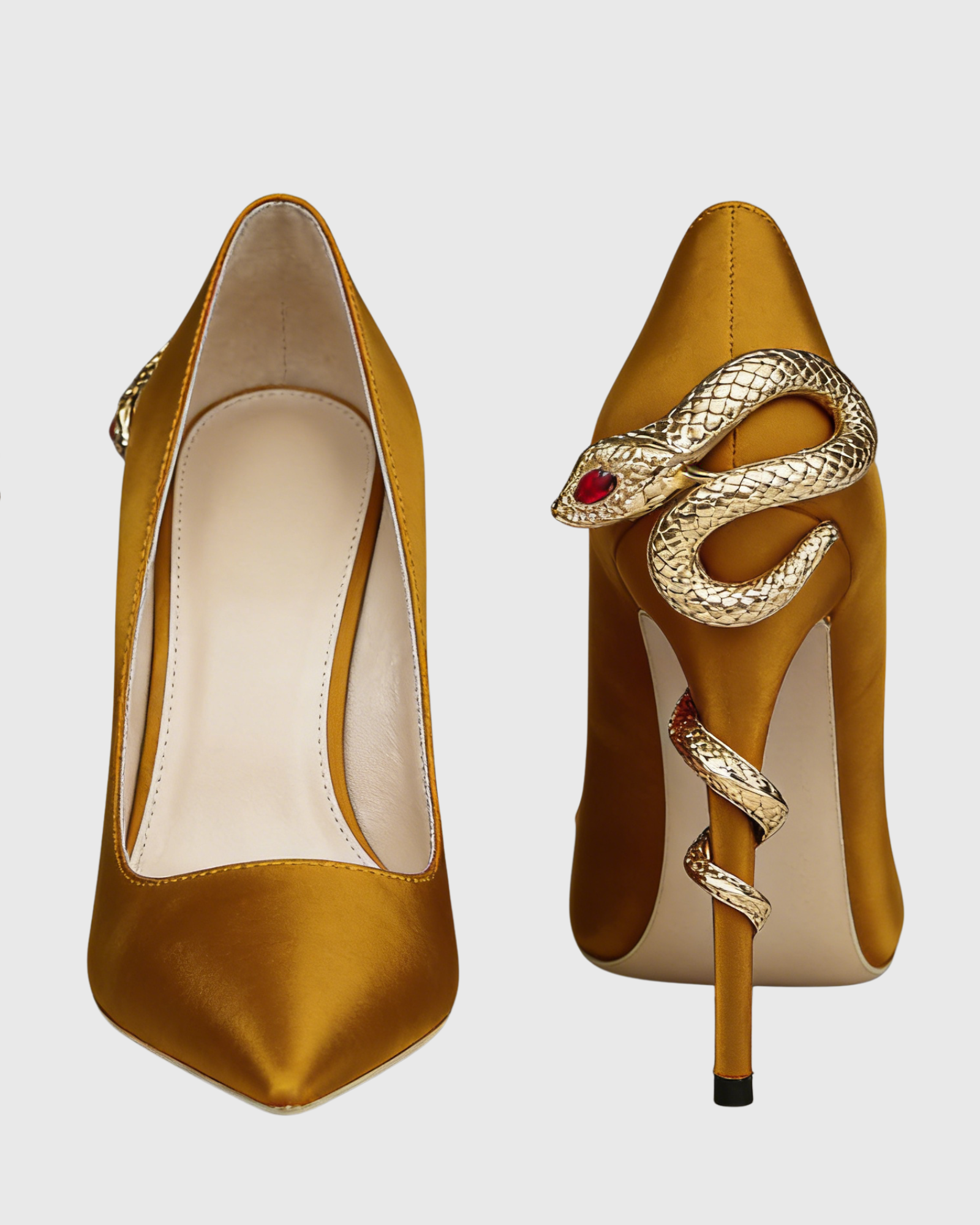 Elevate your evening look with the Eadgar Satin Rhinestone Snake Heels, where luxe meets edge. Crafted in rich brown satin, these statement heels feature intricate rhinestone detailing and a striking snake-inspired design that commands attention. The sleek silhouette pairs effortlessly with dresses, skirts, or tailored trousers for a sophisticated yet bold aesthetic. Perfect for special occasions, nights out, or whenever you want to make an unforgettable impression. Step into confidence with every stride.