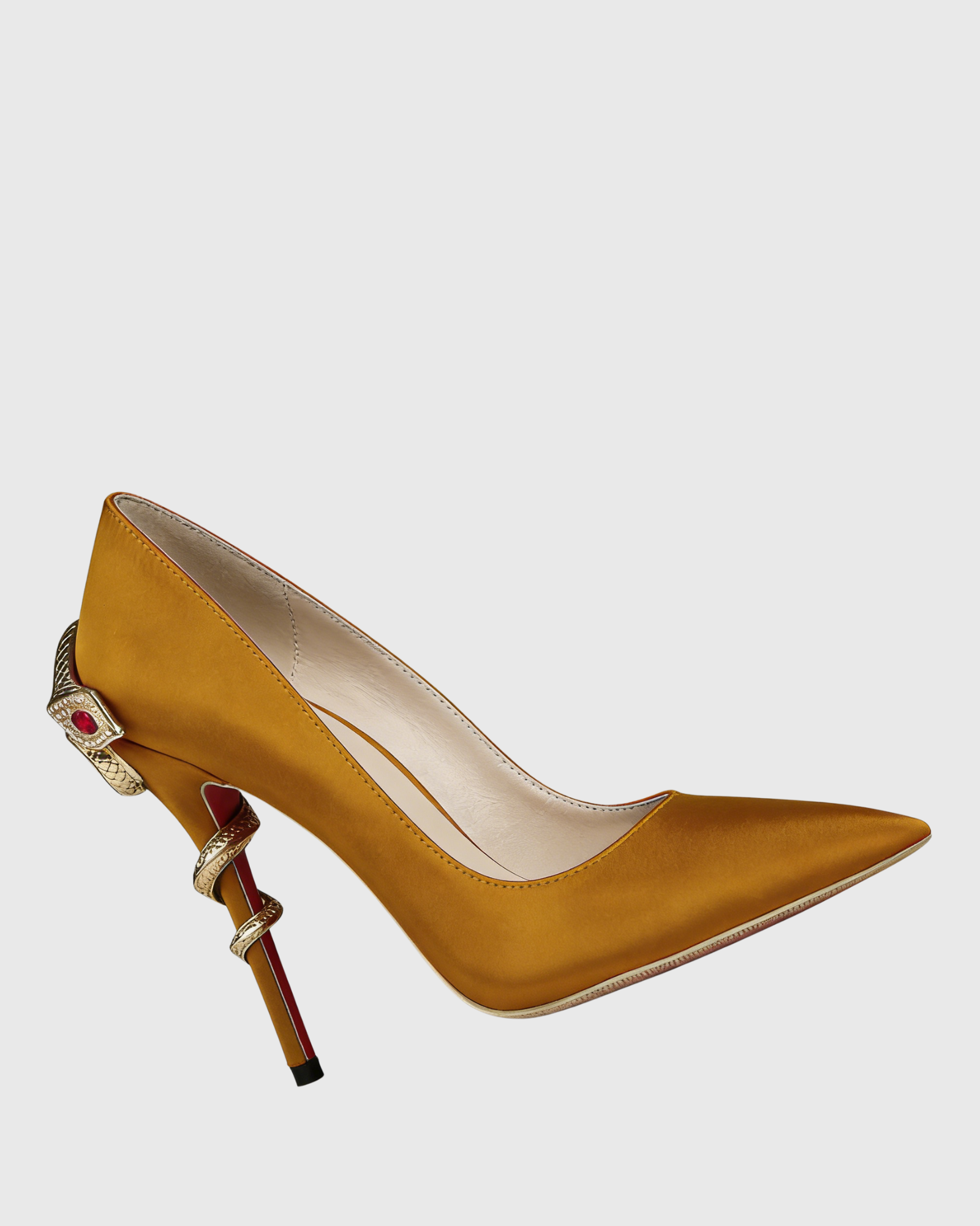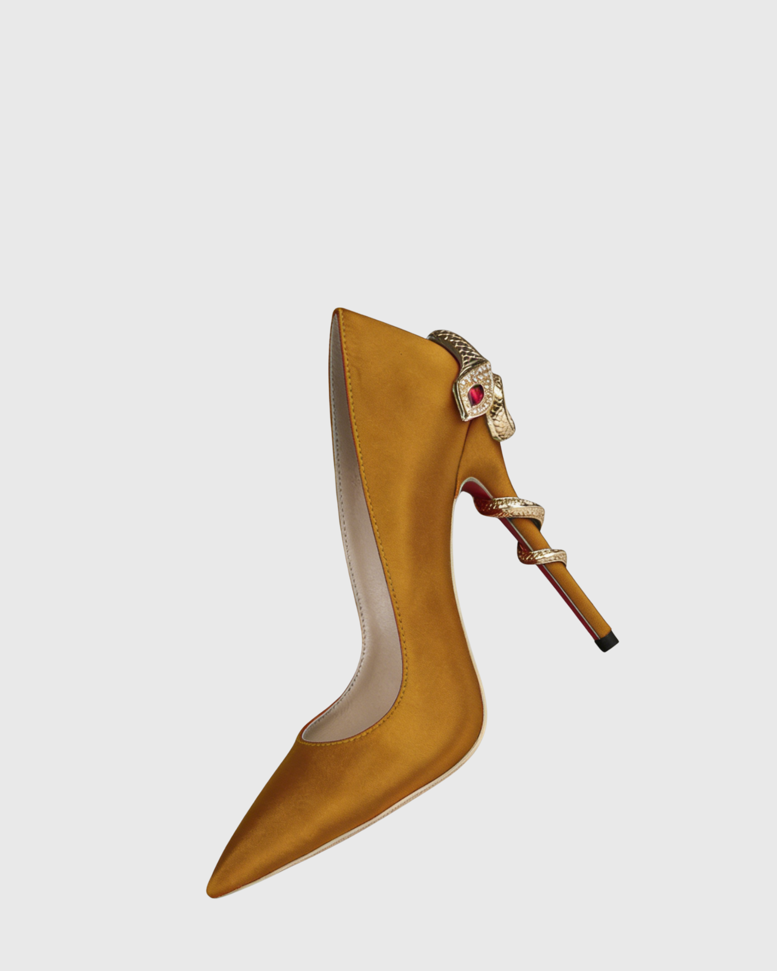 Eadgar Satin Rhinestone Snake Heels In Borwn