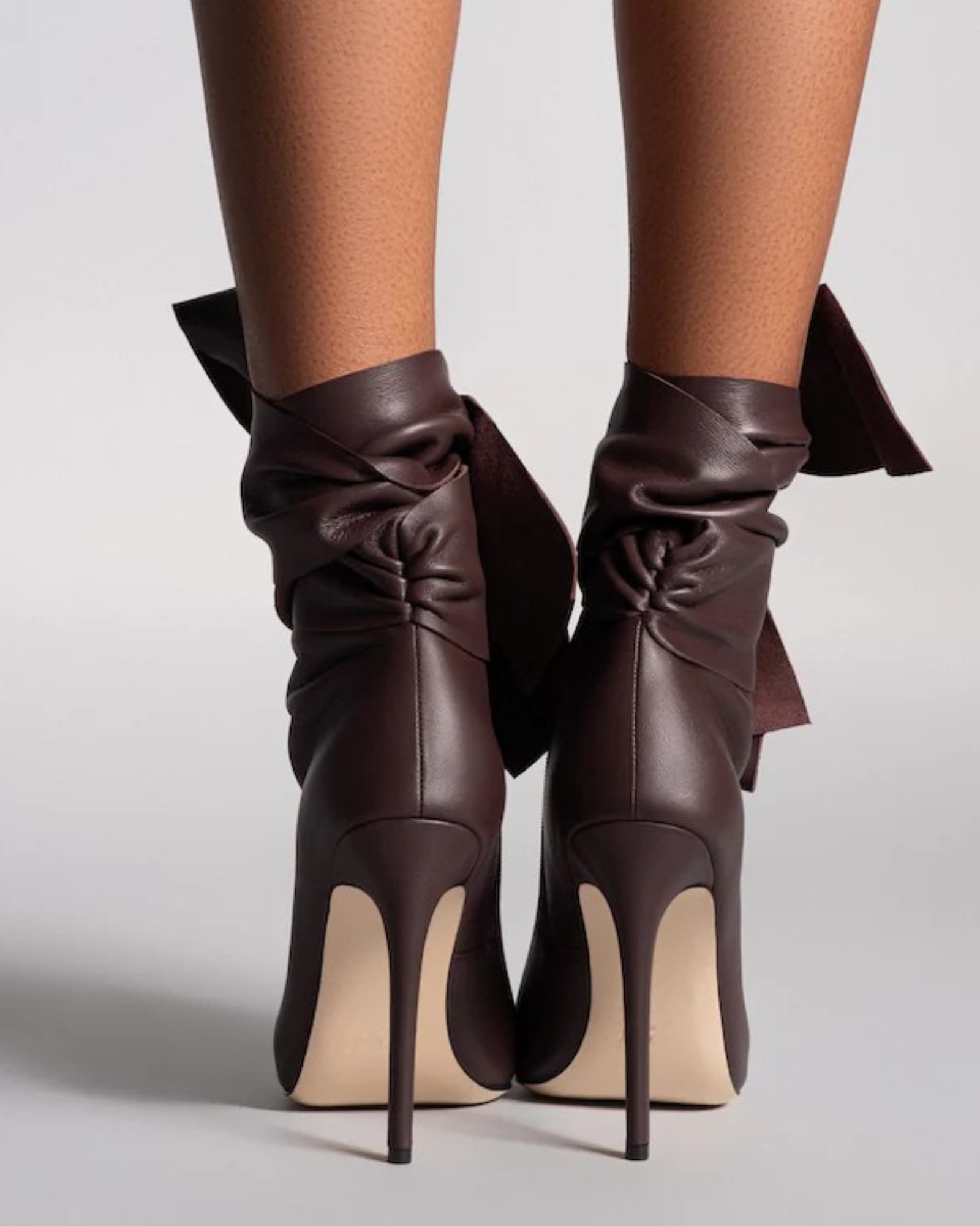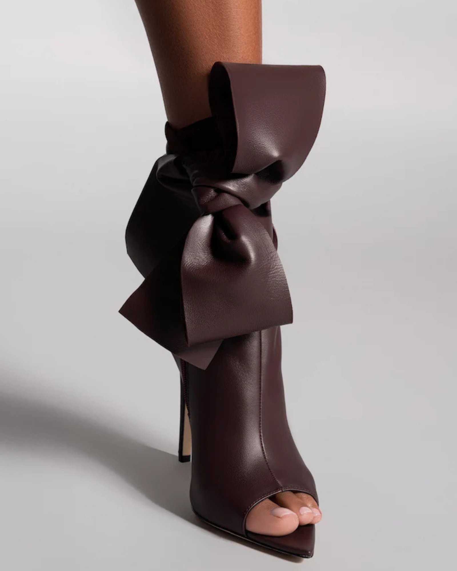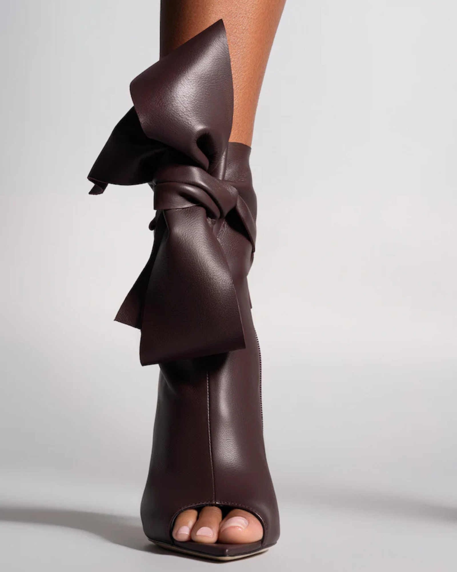 Edik Tie Up Bow Open Toe Boots In Brown Step into effortless style with these striking open-toe boots. The adjustable tie-up design offers a customizable fit that adapts to your foot, while the rich brown leather complements any wardrobe. Perfect for transitional seasons, these boots balance edgy open-toe appeal with the structure and support of a full boot silhouette. Whether you're dressing up for an evening out or elevating your everyday look, the Edik boots deliver versatile sophistication with modern flair.