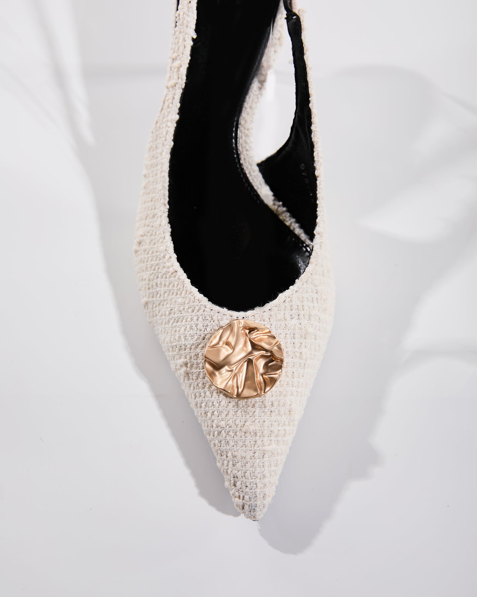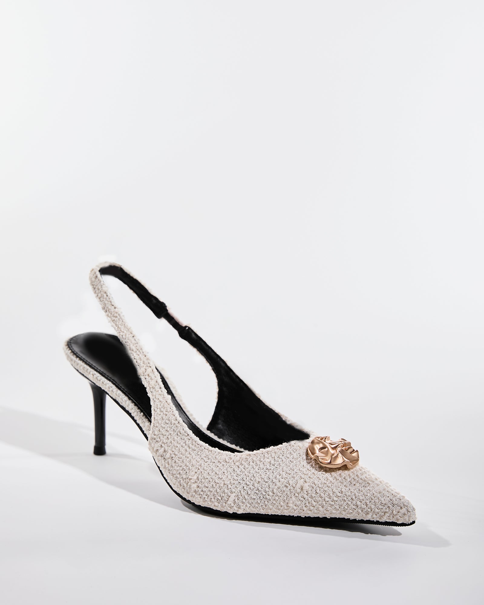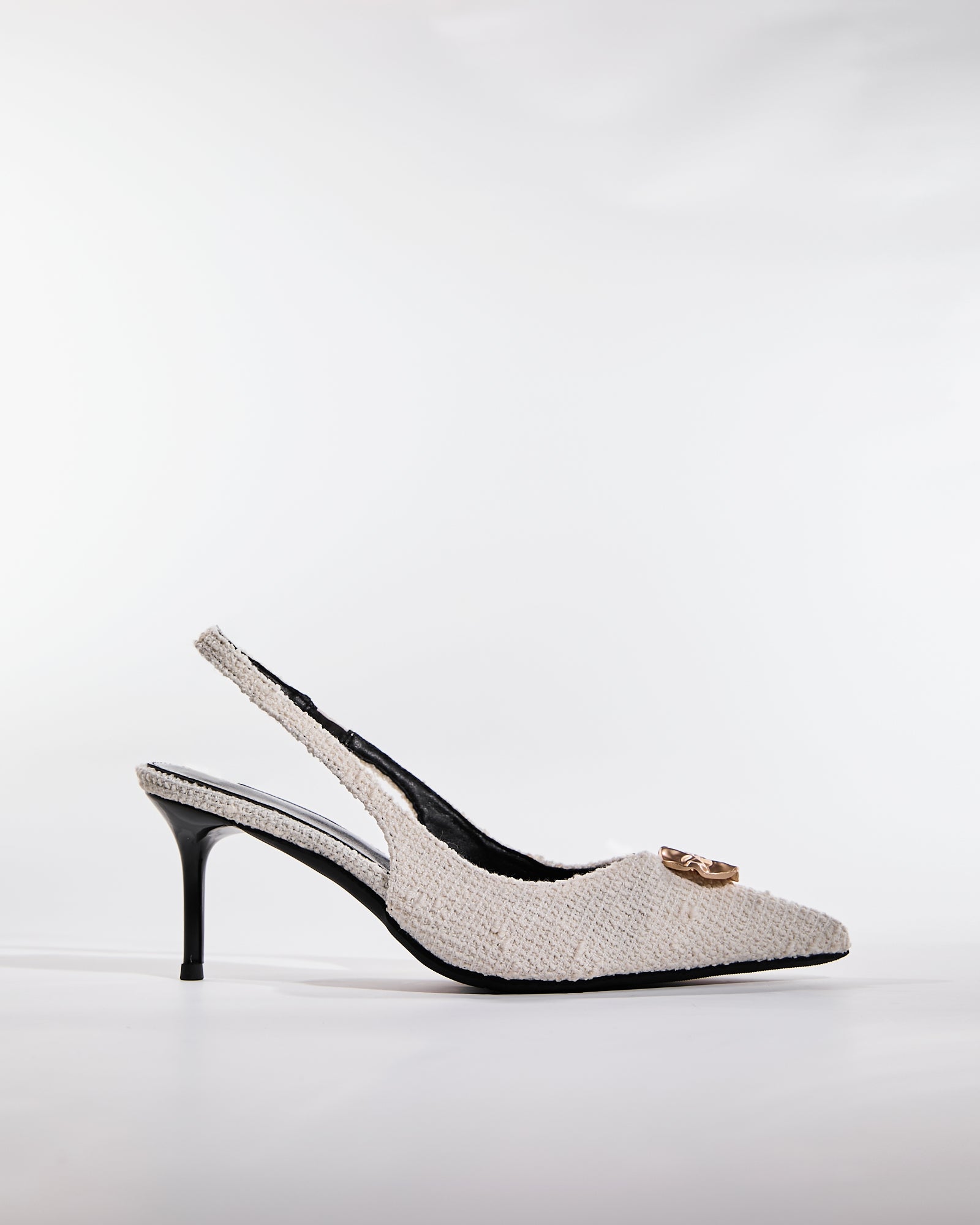 Introducing the Leila Tweed Slingback Pumps in White! Elevate your shoe game with these stylish and versatile pumps. Made from premium tweed material and featuring a sleek slingback design, these pumps are perfect for any occasion. Step into comfort and style with Leila.