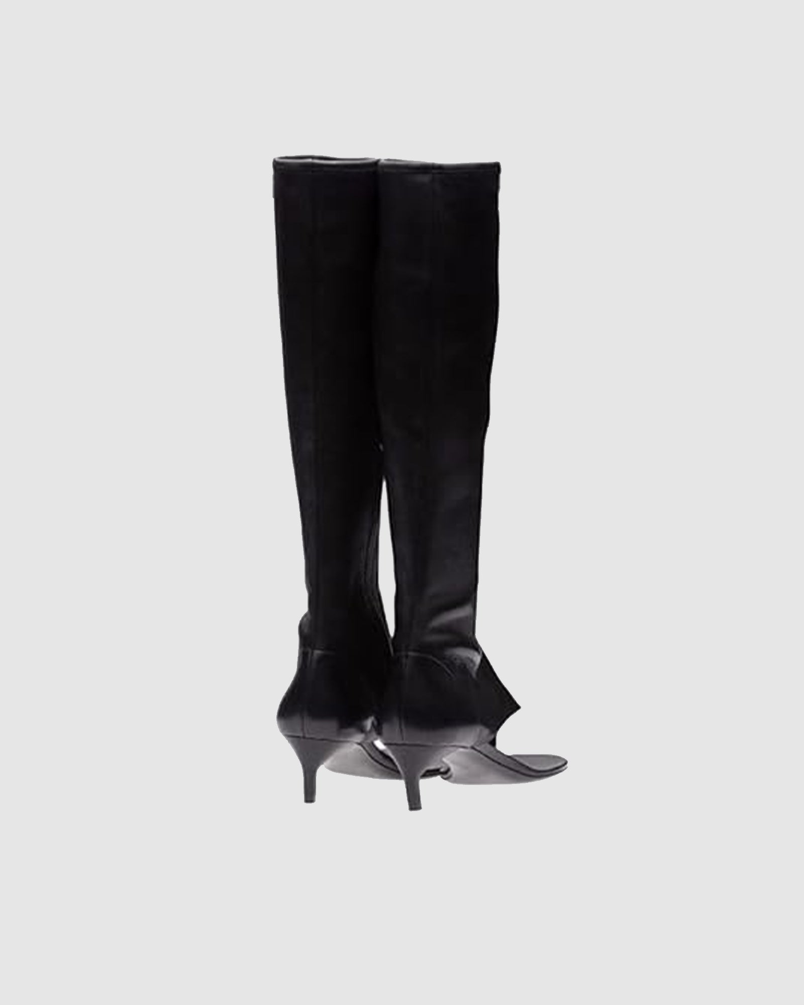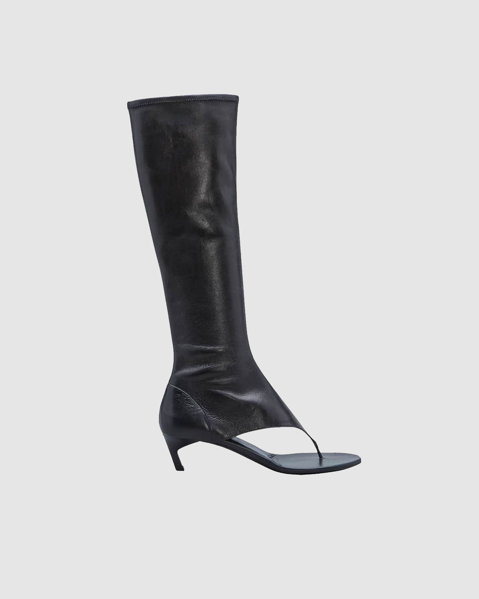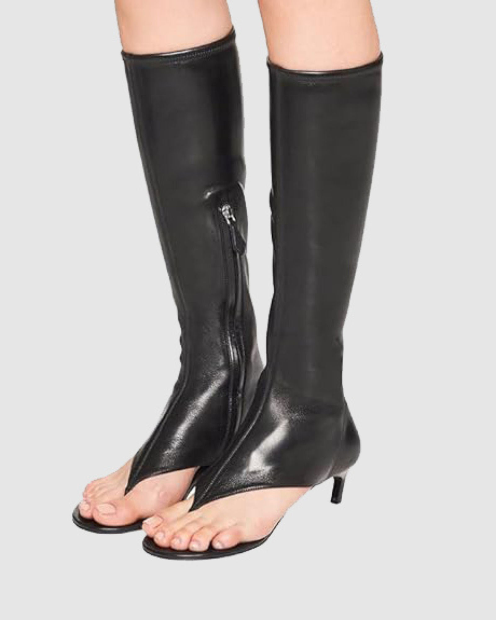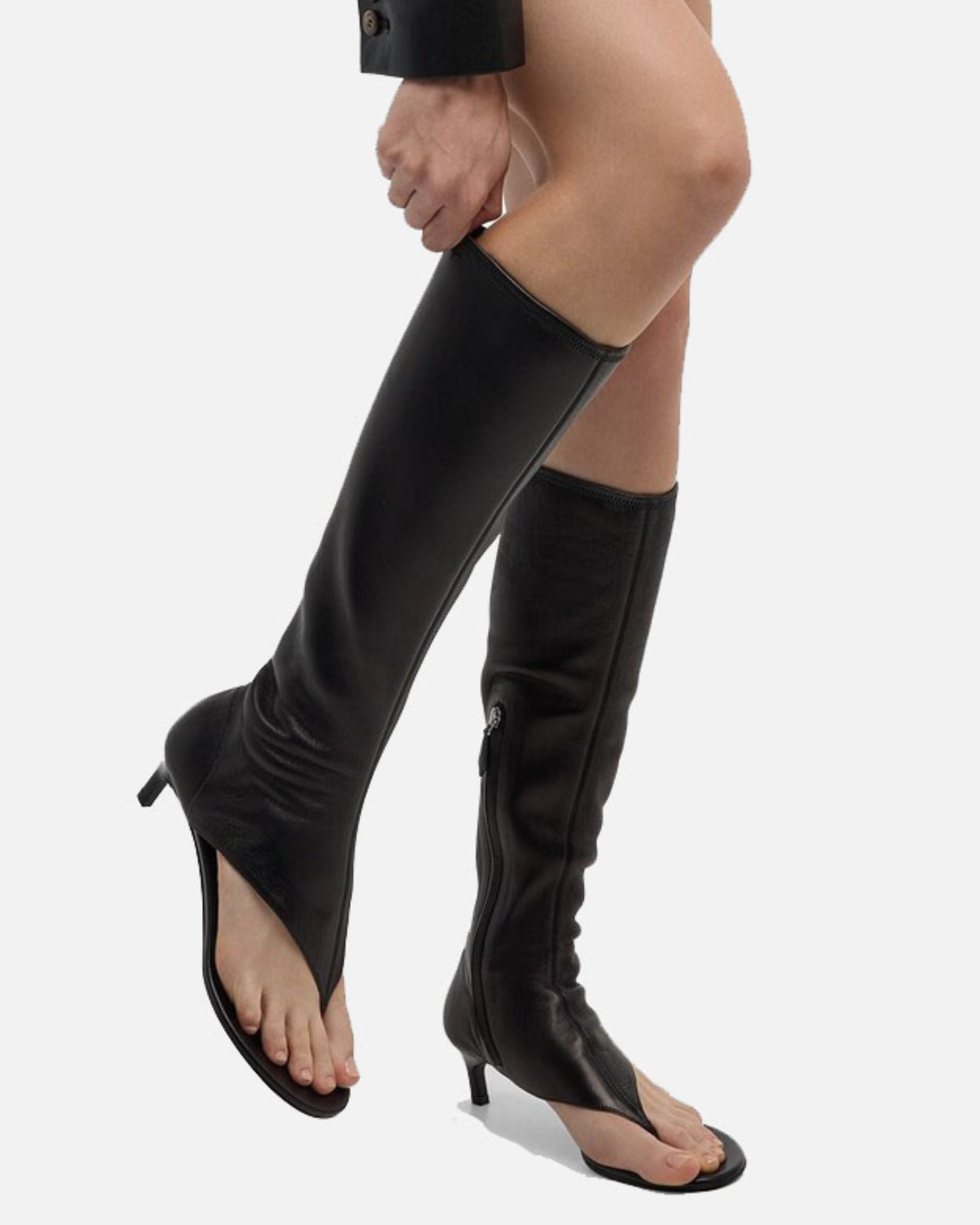 Elevate your shoe game with Marta's Thong leather knee high boots in black. Made with high-quality leather, these boots are perfect for any occasion, from a night out to a day at the office. With their open toe design, they add a touch of modern sophistication to any outfit.