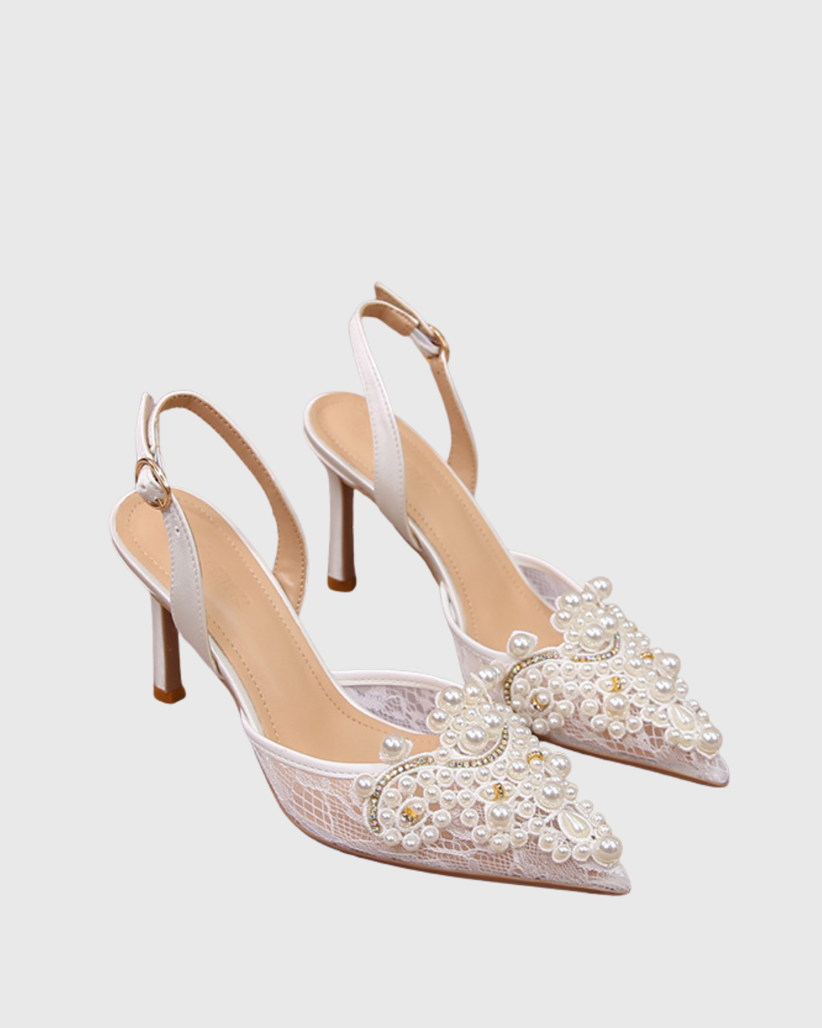 Elevate your formal wardrobe with these stunning Sadb Pearl Embellished Lace Slingback Pumps in white. Delicate lace detailing combined with lustrous pearl accents creates an effortlessly sophisticated look perfect for weddings, galas, or special occasions. The secure slingback design ensures all-day comfort while the refined silhouette flatters any ensemble. A timeless investment piece that transitions seamlessly from ceremony to celebration.