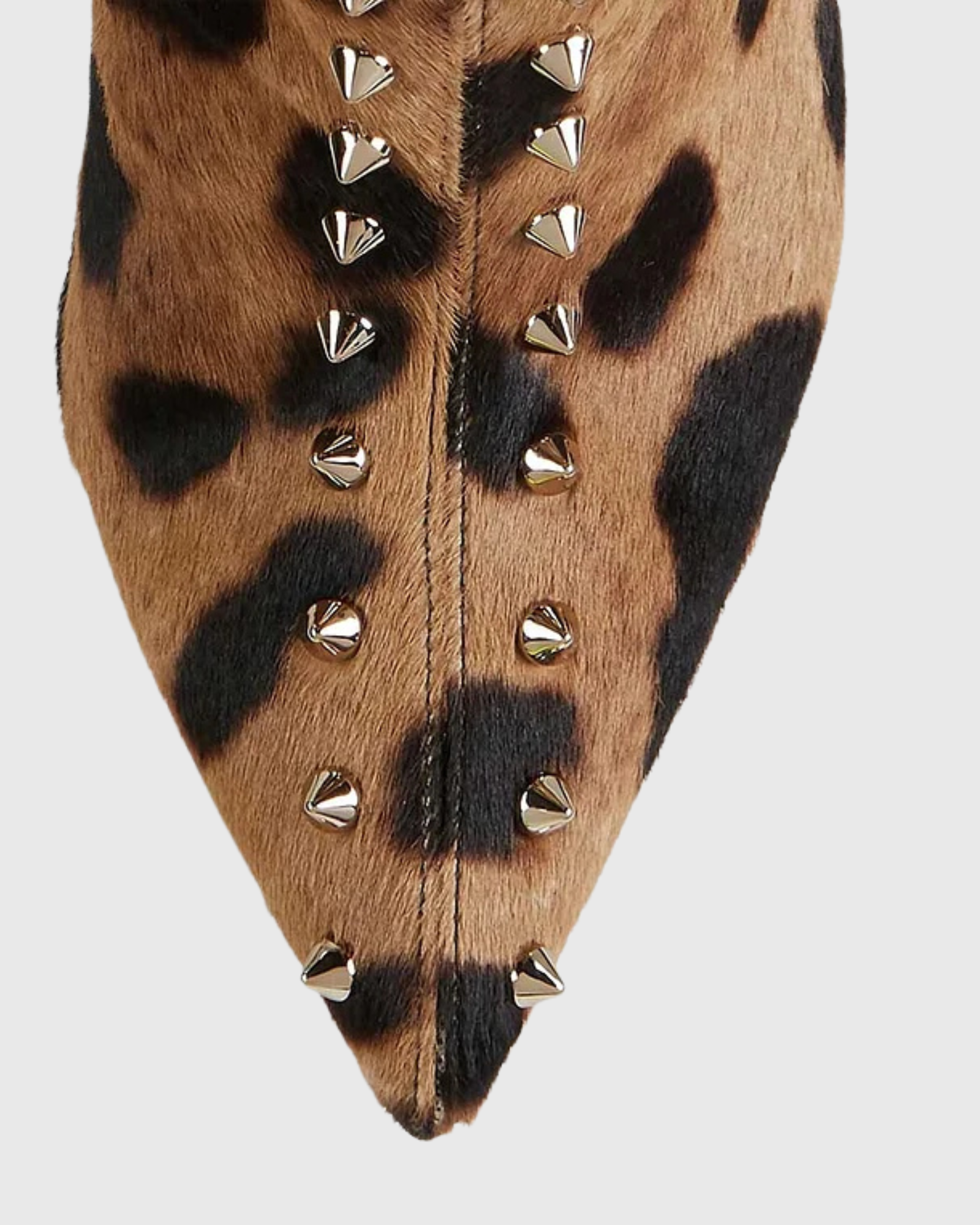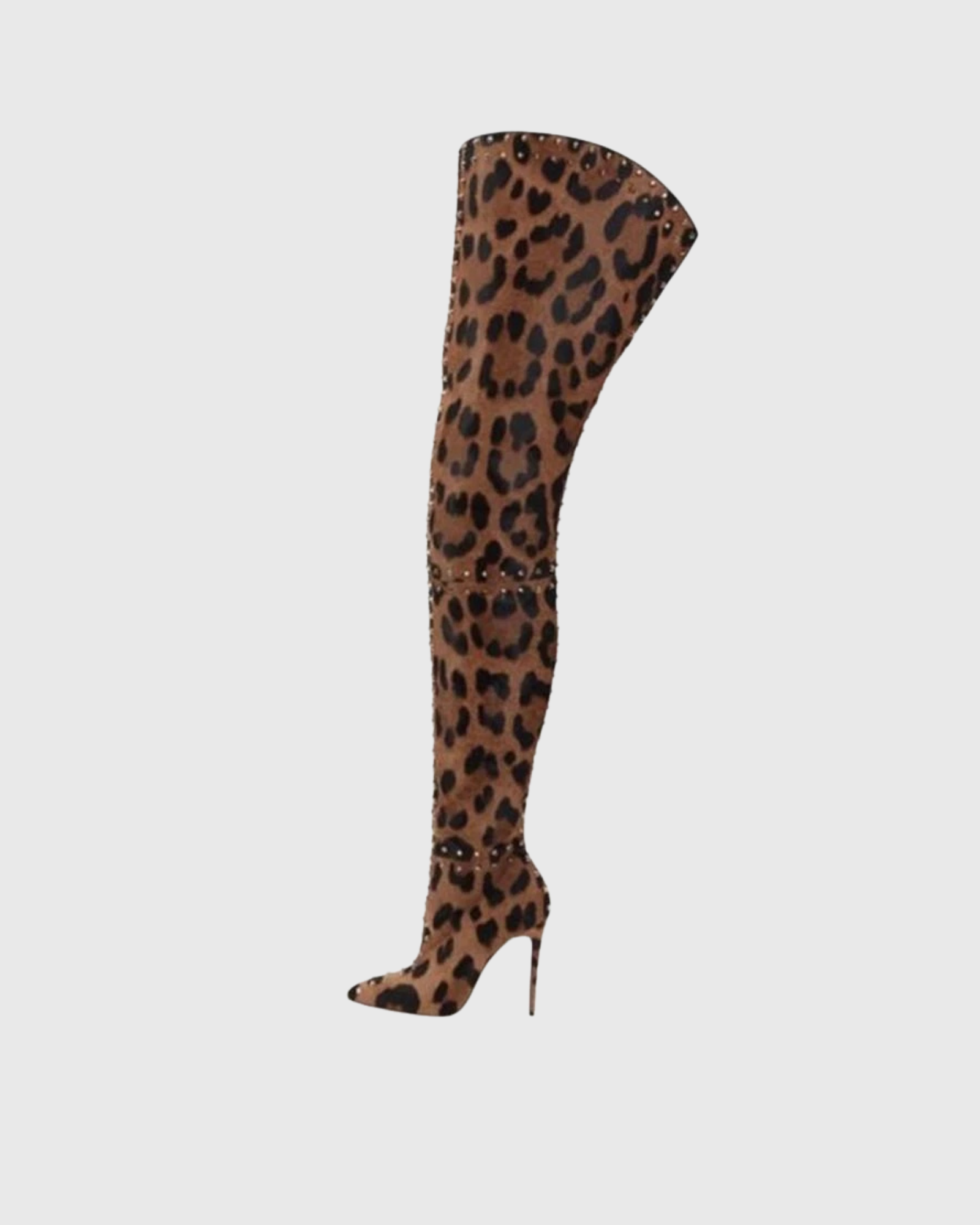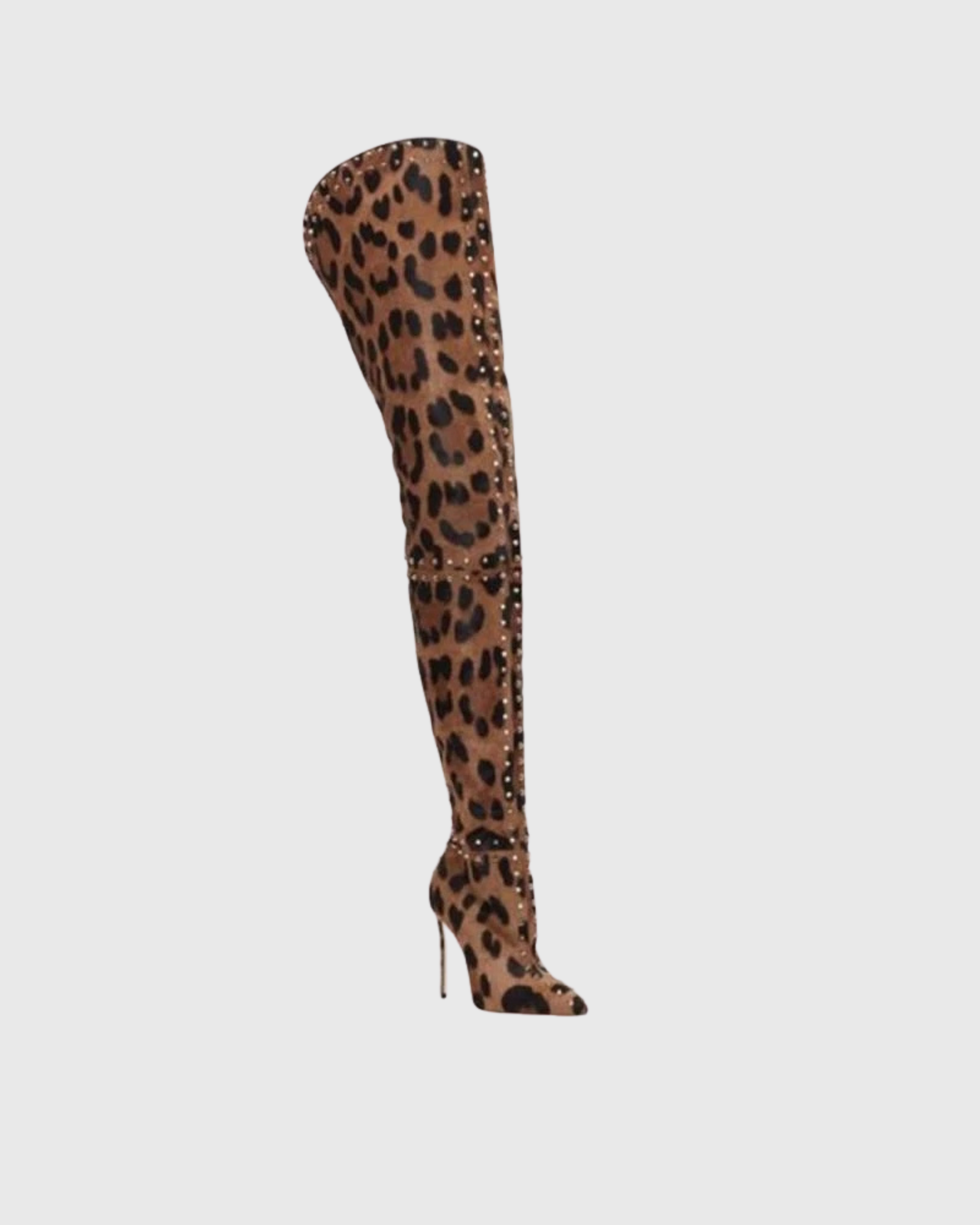 Yayoi Rivet Leopard Over The Knee Boots combine bold animal print with edgy hardware detailing for a statement-making silhouette. The over-the-knee cut elongates the leg while the leopard pattern adds versatile pattern play to neutral and monochromatic outfits. Rivet accents introduce an unexpected textural element, elevating the design beyond standard prints. Crafted for confident styling, these boots transition seamlessly from evening occasions to elevated casual wear.