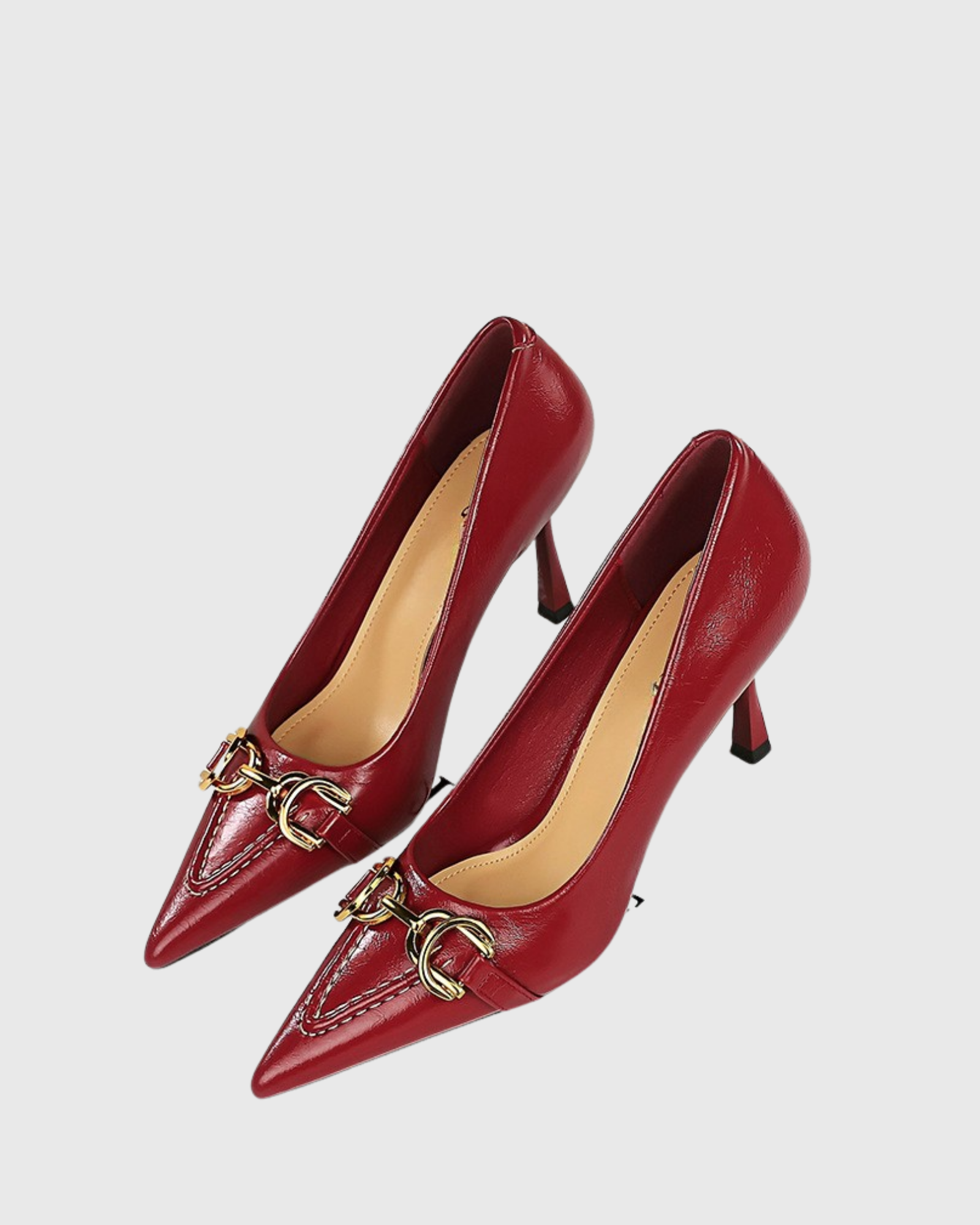 Step into elegance with the Eliza Metal Chain Folded Pumps in Wine. Featuring a rich wine hue and a distinctive metal chain detail, these pumps effortlessly elevate any outfit. Their folded design adds a modern twist while ensuring comfort for all-day wear. Perfect for making a bold statement at work or evening events, these pumps combine style and sophistication to complete your wardrobe.