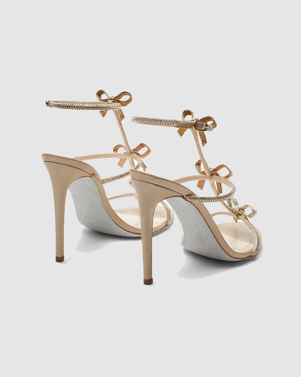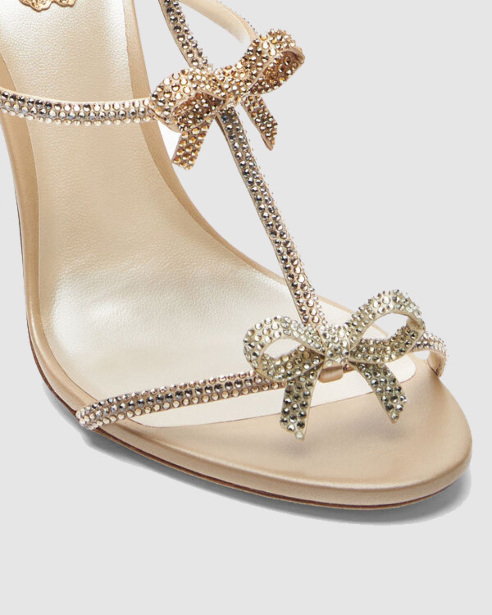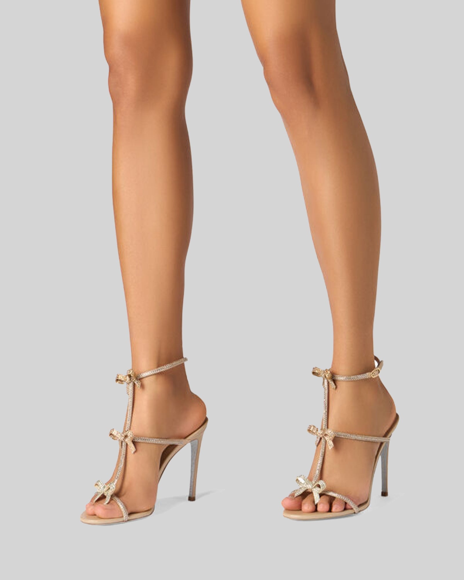 Elegant and sophisticated, the Ilaria Rhinestone Bow Strap Sandal adds a touch of glamour to any outfit. With sparkling rhinestones and a delicate bow strap, this sandal is perfect for special occasions or adding some sparkle to your everyday look. Step confidently and stylishly with the Ilaria Sandal