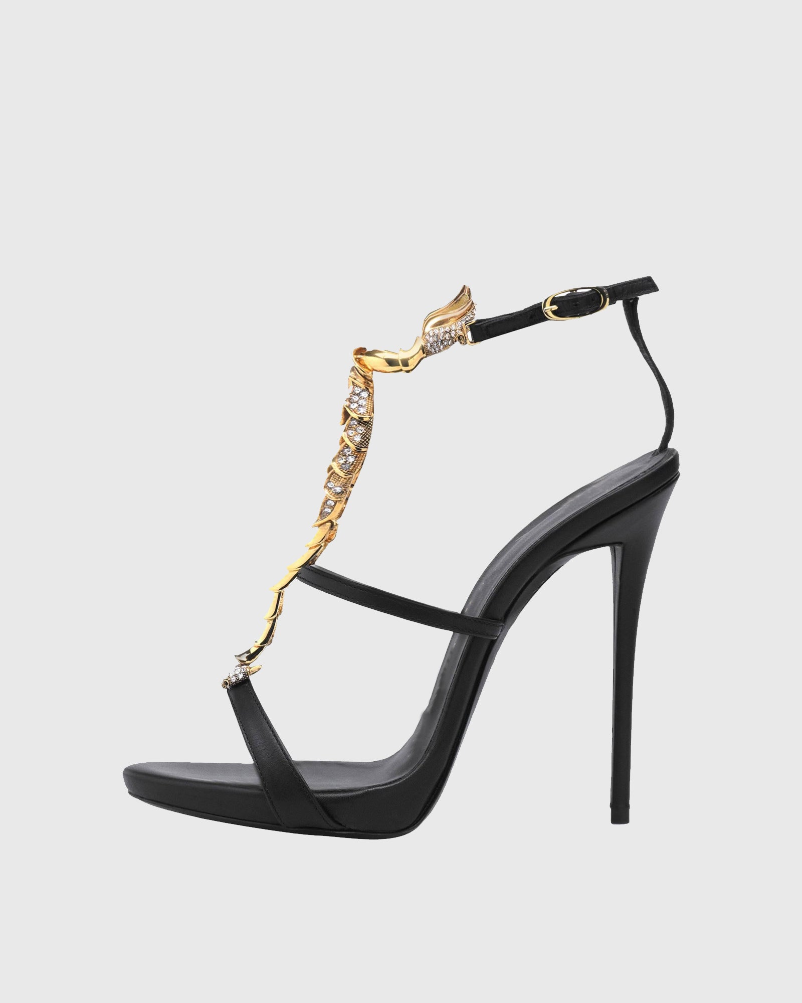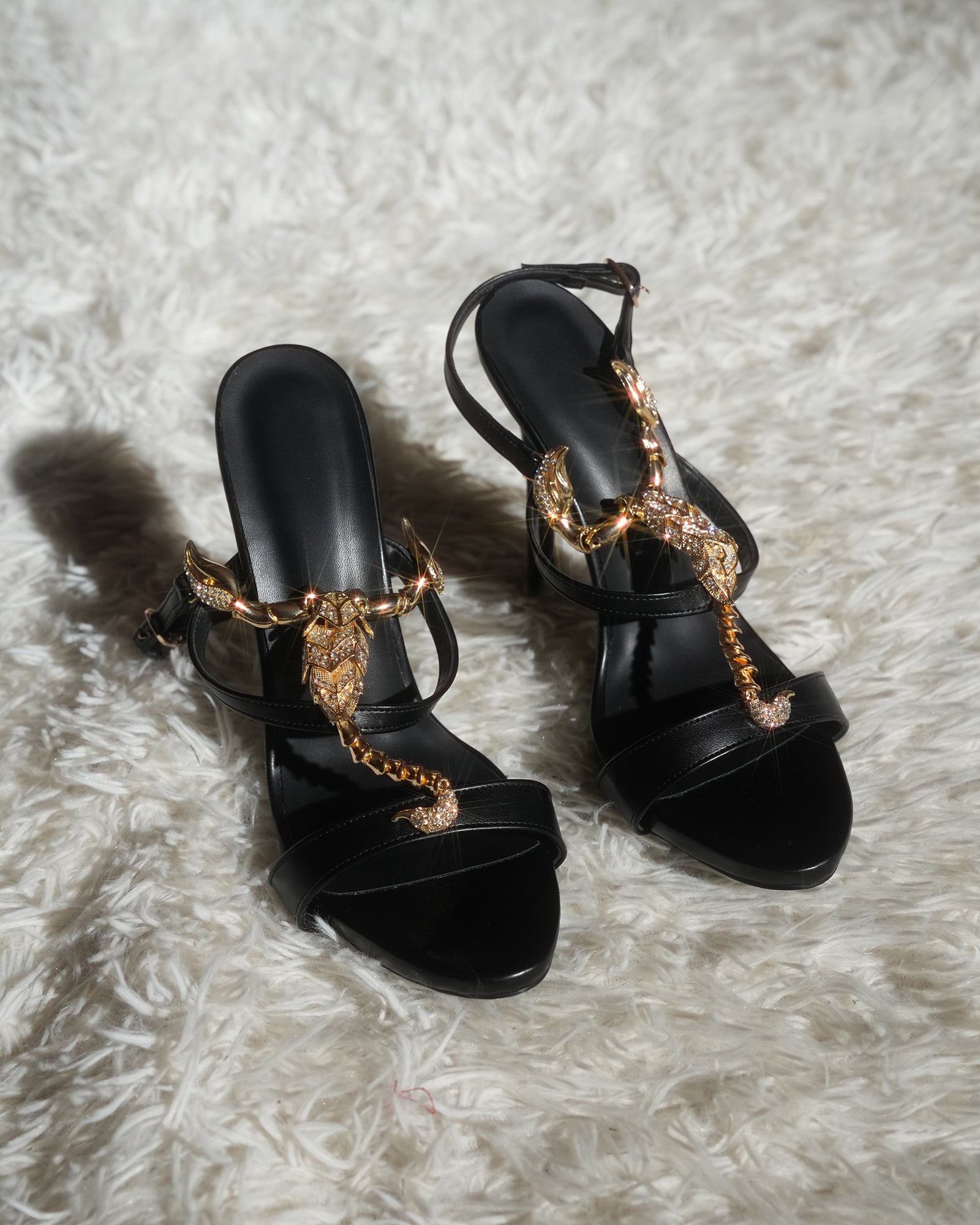 Elevate your style with our Pia Rhinestone Scorpion Strap Sandals. With stunning rhinestone detailing and a unique scorpion strap design, these sandals are sure to catch attention. Step out in confidence and show off your edgy side with these trendy and comfortable sandals.