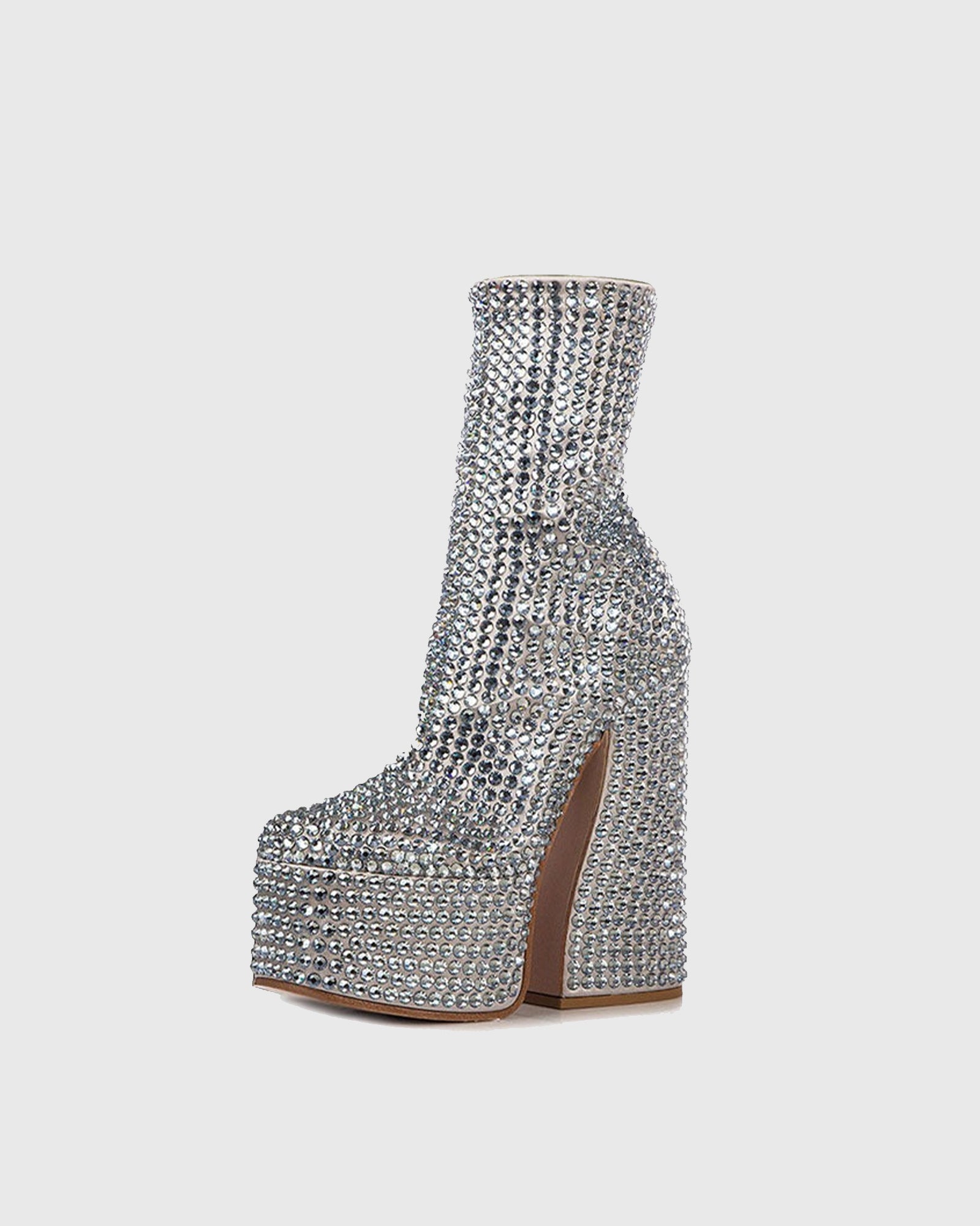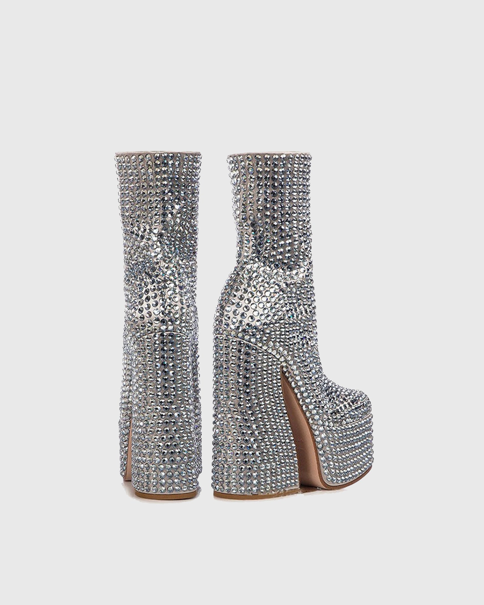 Elevate your style with our Cecilia Rhinestone Embellished Platform Mid Calf Boots, designed for ultimate glamour and comfort. The stunning rhinestone embellishments will add a touch of sparkle to any outfit, while the platform sole provides stability and support. Step out in confidence and turn heads with every step in these silver boots.
