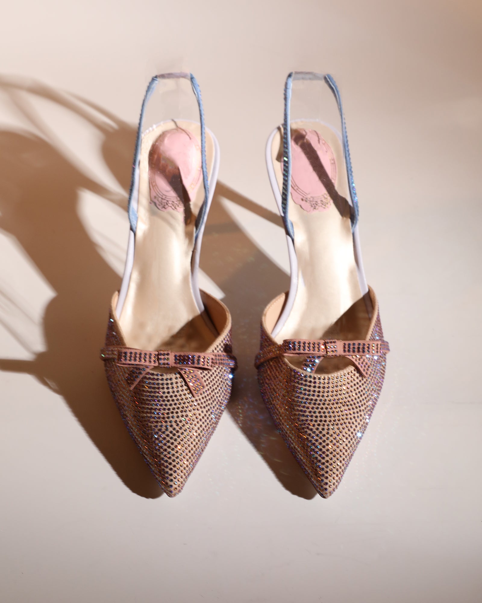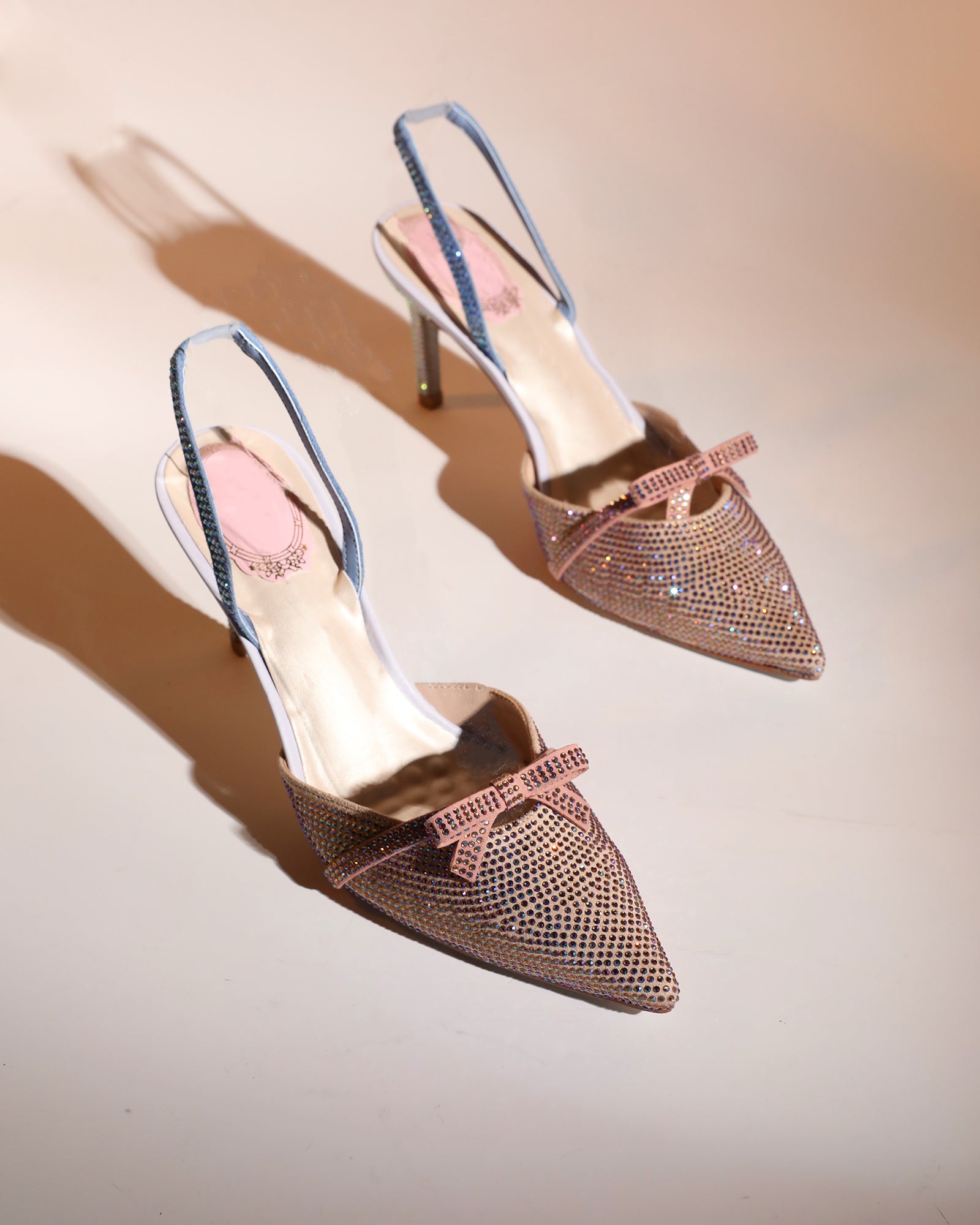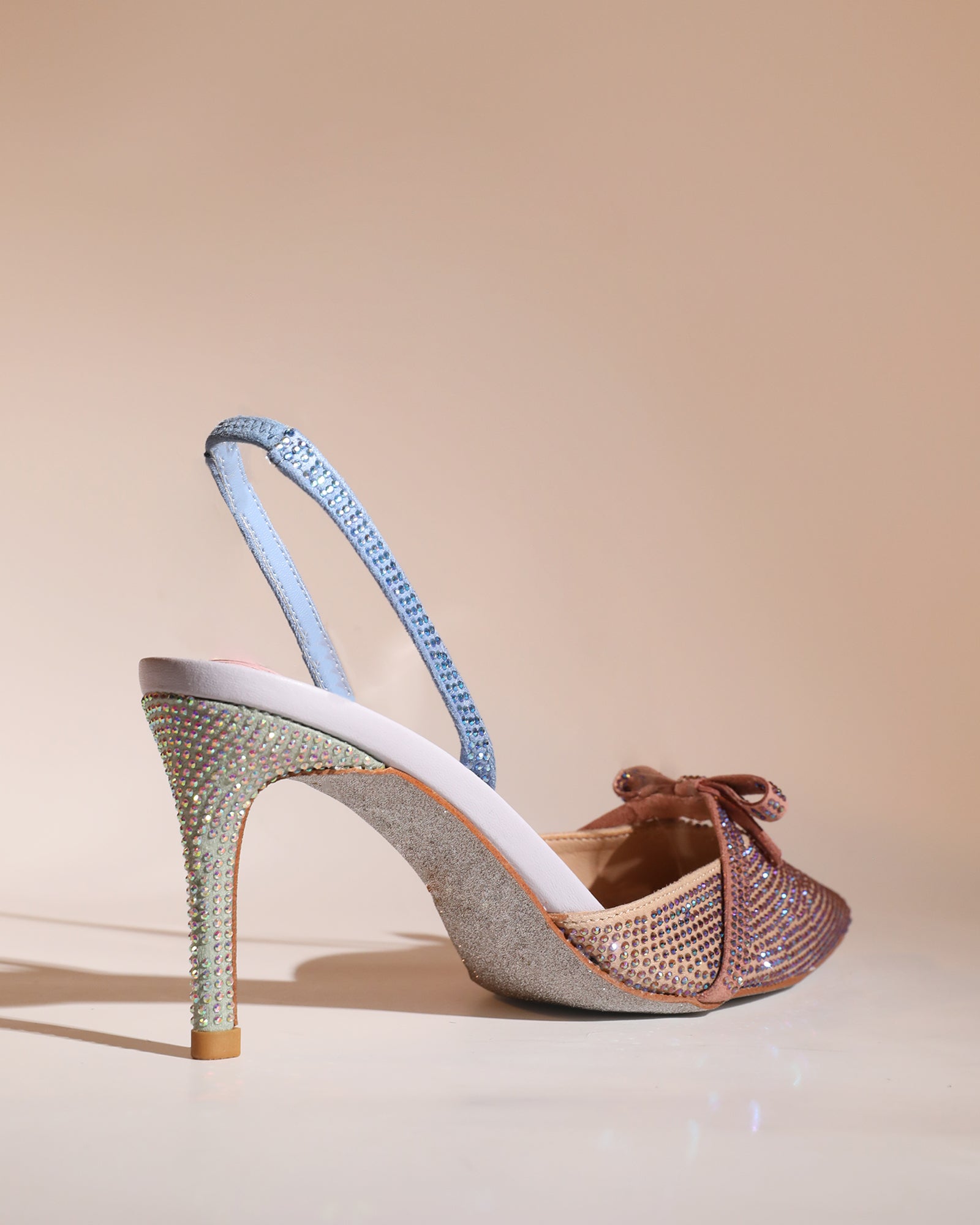 Elevate your style with the Easton Bow Rhinestone Slingback Pumps in Champagne. These glamorous heels feature sparkling rhinestone details and a chic slingback design, perfect for any special occasion. Add a touch of luxury and make a statement with every step you take!
