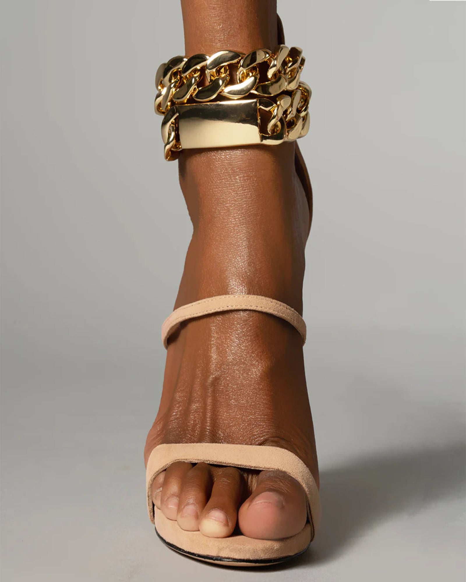 Step into elegance with the Iolanda Metal Chain Strap Sandals in Nude. Featuring a chic metal chain detail, these sandals add a touch of sophistication to any outfit. The nude shade complements a variety of styles, making them a versatile addition to your wardrobe. Designed for both comfort and style, they are perfect for elevating your look from day to night with ease.