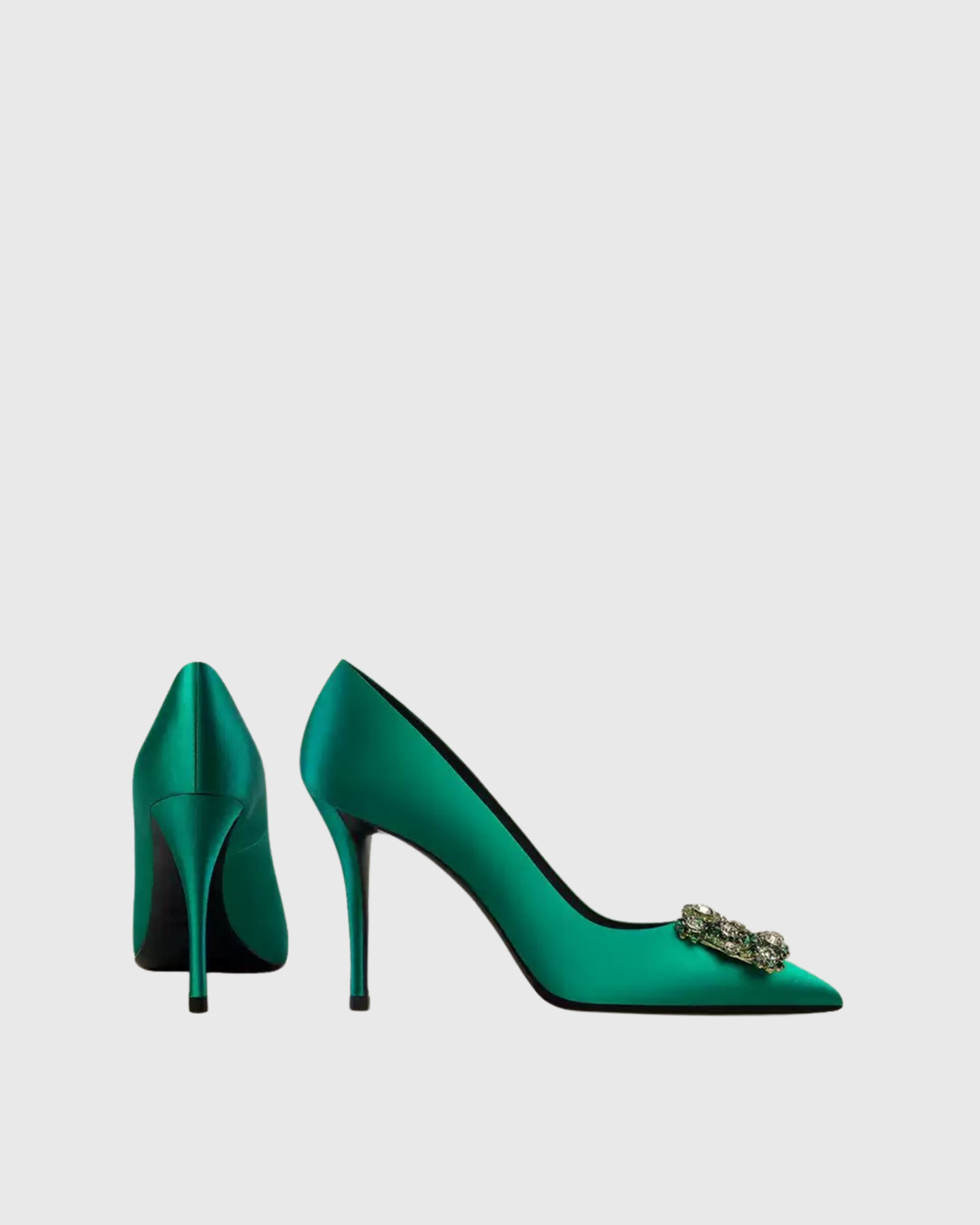 Elevate your evening look with the Sadah Rhinestone Buckle Pumps in Green. These stunning heels feature a dazzling rhinestone-embellished buckle that catches the light with every step, adding instant glamour to any outfit. The rich green hue offers a sophisticated alternative to traditional neutrals, making these pumps a versatile choice for cocktail events, weddings, or nights out. Crafted for both style and comfort, they're the perfect finishing touch for anyone seeking to make a memorable impression.