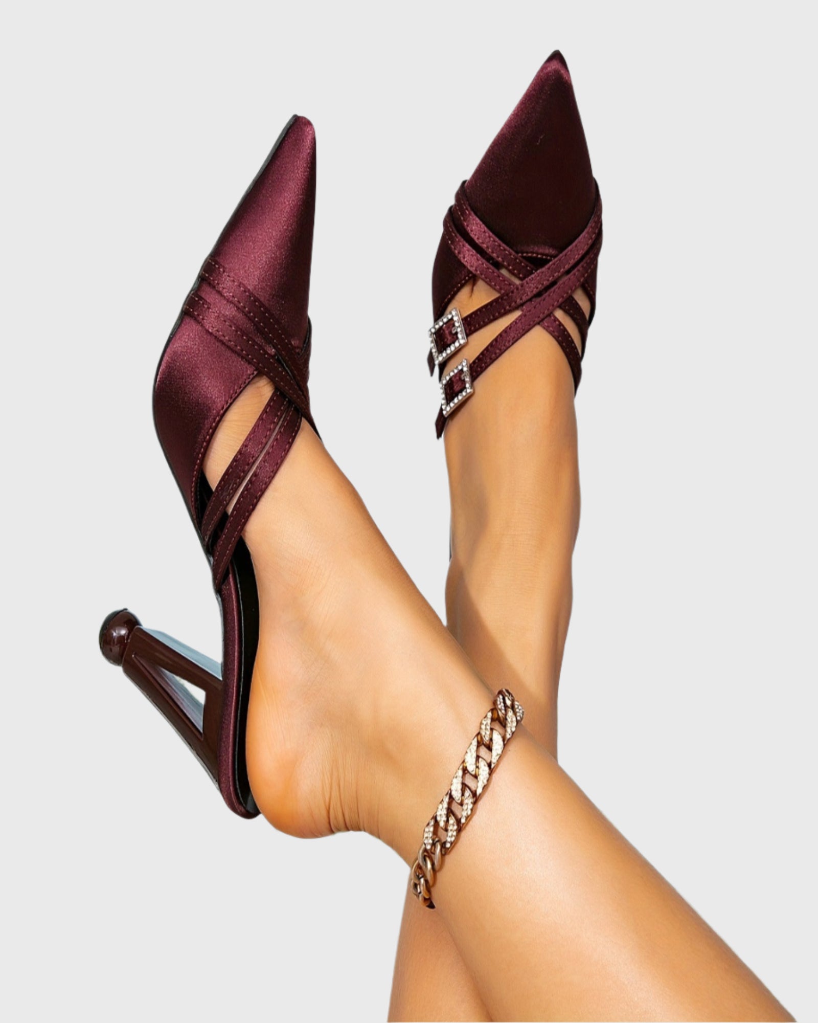 Step into elegance with the Chloe Buckle Cross Mules in Wine. Featuring a rich wine hue and stylish buckle cross detailing, these mules offer a perfect blend of sophistication and comfort. Their sleek design easily elevates any outfit, making them ideal for both day and evening wear. Add a touch of refined charm to your wardrobe with these versatile mules that promise lasting style and effortless grace.