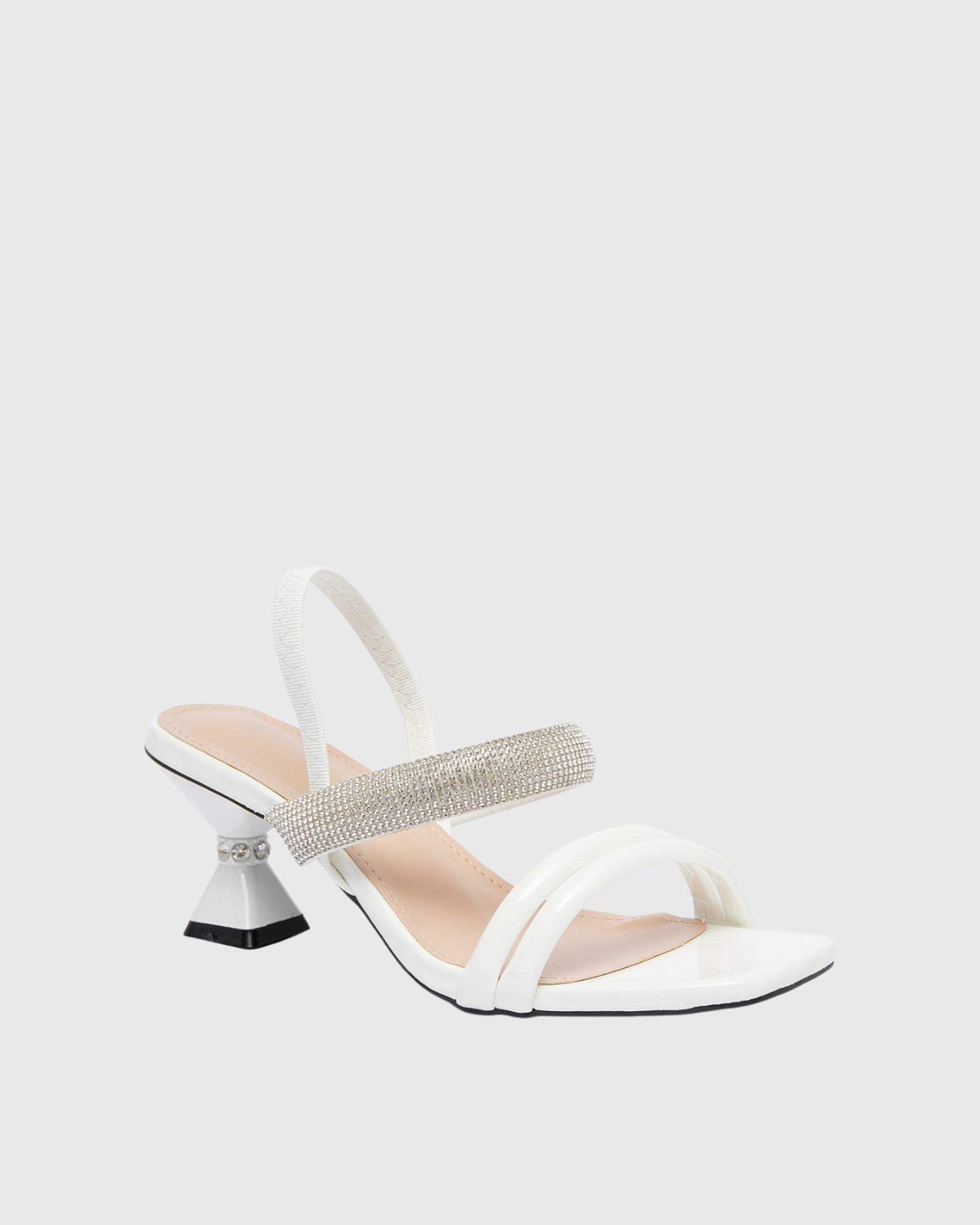 Step out in elegance with the Cahya Rhinestone Strap Flared Heels in White. Featuring shimmering rhinestone straps and a stylish flared heel, these heels add a glamorous touch to any outfit. Perfect for special occasions or elevating your everyday look, they combine eye-catching sparkle with comfortable support, making you feel confident from day to night.
