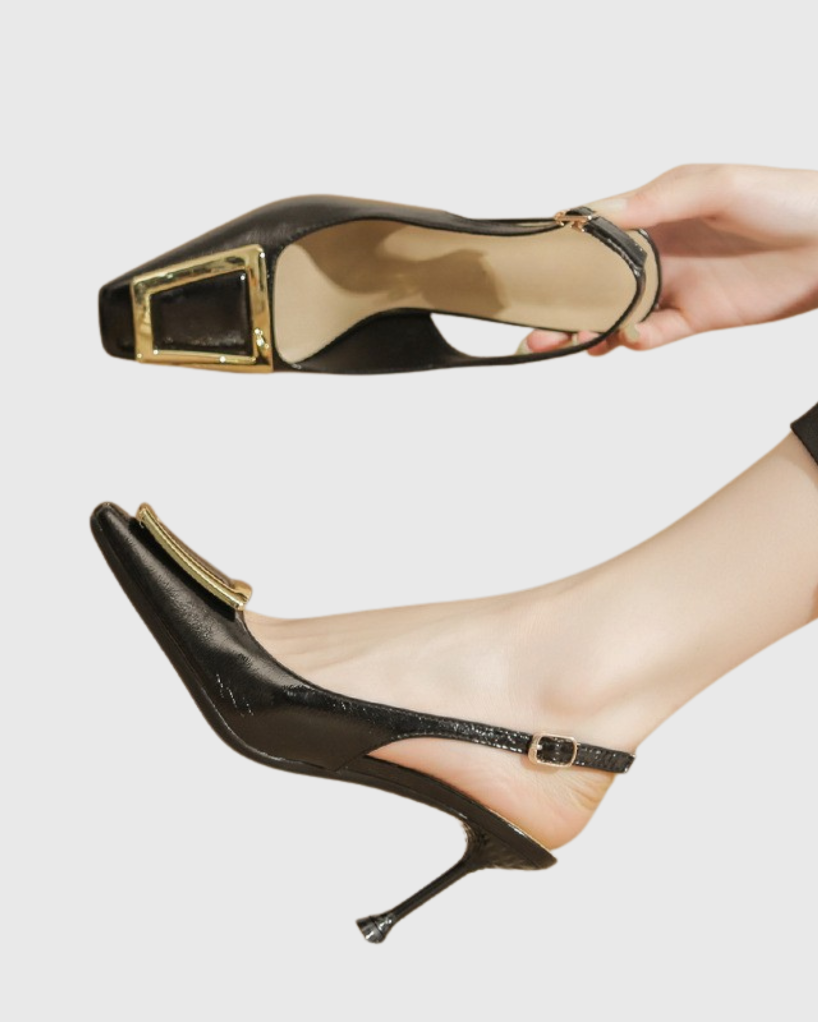 Elevate your style with the Sadah Metal Buckle Slingback Pumps in Black. Featuring a sleek silhouette and a striking metal buckle, these pumps combine elegance with modern edge. The slingback design ensures a secure, comfortable fit, perfect for all-day wear. Whether at the office or out for an evening, these versatile black pumps add a polished finish to any outfit. Step confidently and make a lasting impression wherever you go.